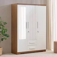 Combining modern design with practicality, this wardrobe is the perfect solution for keeping your clothing and accessories neatly arranged in style. It is made of engineered wood with a heat, scratch, and stain-resistant melamine finish. The 2 external drawers provide easy-to-access storage. The 8 shelves and a hanging rod provide ample space, offering easy organisation. The 3 doors come with external locks. The chest-view mirror on the door adds to the convenience.