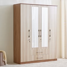 Enhance your bedroom with the 4-door wardrobe from Home Centre. Crafted from prelaminated engineered wood, it features fiber boards compressed with hardwood extracts for a sturdy core and excellent screw-holding capacity. The melamine finish includes a protective plastic layer that resists scratches, dents, moisture, heat, and stains. The wardrobe offers 11 shelves, 2 external drawers, and 1 internal drawer and shelf for ample storage. It also includes 2 securely mounted external mirrors, reinforced with taped and glued edges for safety, along with 3 safety external locks and one hanging rods to keep your clothes organized and your space tidy.