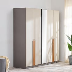 Bring this elegant 4-door wardrobe from Home Centre to brighten up the space in your bedroom. Made with sturdy prelaminated engineered wood possess a stronger core with excellent screw-holding capacity, and chemically treated to resist termites and borer infestations. Made with a fabric base, faux leather handles have a supple feel. They are more durable and show less wear than leatherette. This wardrobe features with several shelves along with six adjustable glass shelves, located in the middle of the wardrobe covered with glass shutters and aluminum channels. Comes with 2 internal drawers provide secure organization for valuable items, offering visibility and quick access. High-quality butterfly hinges are used for better performance and are corrosion resistance, with easy realignment over time. This wardrobe comes with 2 hanging pipes for easy clothes organisation. This wardrobe is completed with suede finish for tactile texture, adding a sense of luxury and warmth to interior spaces. The led stripes are fixed in the middle glass storage section, adding a luxurious touch to the wardrobe.