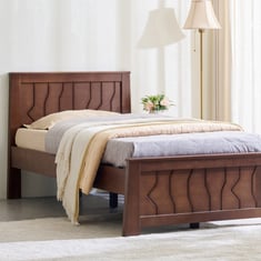 Enhance your bedroom with this single bed from Home Centre, made from kiln-dried and chemically treated mahogany wood for stability and minimal seasonal expansion or contraction, making it perfect for indoor use. The furniture features a matte PU polymer paint finish that provides a smooth, reflective surface with a seamless appearance across the panel fronts and edges. Furthermore, the 16 mm thick mattress panel evenly distributes load, ensuring consistent comfort while resting.