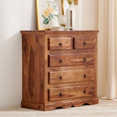 Transform your bedroom into a clutter-free space with this chest of drawers from Home Centre. Crafted from kiln-dried sheesham wood with a durable lacquer finish, it is safe for indoor use and resistant to seasonal changes. With 5 external drawers, it offers ample storage for folded clothes, accessories, and more, making it a practical addition to any room needing organized storage. Perfect for homes with limited closet space, it keeps everything from soft clothing to personal items neatly arranged.