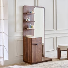 Enhance your bedroom with this dresser mirror, crafted from engineered wood resistant to termites and woodborers. The melamine prelam layer adds protection against scratches, dents, moisture, heat, and stains, while the E2 certification ensures safe indoor use. The ceramic top provides a non-porous, heat-resistant surface that serves as a focal point. This dresser features a full-length mirror, a drawer, a cabinet for makeup accessories, and 3 open shelves for additional storage.