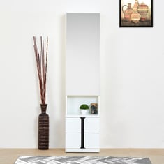The collection demonstrates a practical, functional & modernist aesthetic sense. Truly follows LESS IS MORE. The rounded forms and cut outs are a highlight in the design. The simplicity & smoothness of white high gloss gives a peaceful feel to the space, yet the black element pops out to keep the balance of fun and young. Soothing to the eyes, this range is backdrop to a neutral colour palette for a pop decor to bring out the vibrancy in one�s home.The convenient larger mirror will make it easy to get ready and to help you add those finishing touches. There is huge hidden storage space behind the mirror and open storage left side of the mirror. There is 2 drawers for additonal storage option.It is the best way to consolidate all your jewelry pieces, health and beauty supplies, makeup and accessoriesPrimary Feature : It is engineered wood with smooth surface with no grain makes it easier to work and paint. It is resistance to termite and wood borer. Secondary Feature : It is engineered wood with smooth surface with no grain makes it easier to work and paint. It is resistance to termite and wood borer. Feature : Foil lamination is a process where by the fascia and the edges are laminated homogenously with PVC foil thru a hot press process. This helps to enhance looks & helping to increase durability. Primary Furniture Material : Engineered wood Material Description : It is engineered wood with smooth surface with no grain makes it easier to work and paint. It is resistance to termite and wood borer.Finish : High Gloss Membrane Foil Finish
