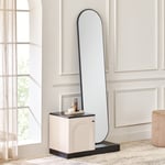 This dresser mirror is crafted from prelaminated engineered wood with a satin finish that provides a subtle gloss, creating a smooth texture and soft glow. The design includes an oval-shaped full-length mirror and a storage cabinet with a shutter, combining both functionality and elegance.