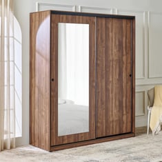 Elevate your bedroom with this 2-door sliding wardrobe. Constructed from engineered wood which is resistant to termites and wood borers. Finished with a melamine prelam which is a protective plastic layer offers enhanced durability and resistance to scratches, dents, moisture, heat, and stains. This wardrobe features multiple shelves, hanging rods, lockable drawer for added storage, and an external lock for extra security. The full-length mirror offers a complete view of your outfit while making the space feel larger and brighter.
