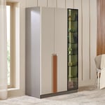 Upgrade your bedroom with this 2-door wardrobe with curio. Constructed from robust engineered wood with a suede finish for warmth and lasting quality, it features termite and borer protection. Faux leather handles offer the look and feel of real leather with enhanced wear resistance. The curio includes scratch and impact-resistant tempered glass display shelves with aluminium channels. With 15 shelves, lockable drawer, and 1 hanging rod, this wardrobe combines functionality and durability.