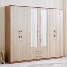 Enhance your bedroom with the 6-door wardrobe from Home Centre. Crafted from prelaminated engineered wood, it features fiber boards compressed with hardwood extracts for a sturdy core and excellent screw-holding capacity. The melamine finish includes a protective plastic layer that resists scratches, dents, moisture, heat, and stains. The wardrobe offers 15 shelves, 2 external drawers, and 2 internal drawer for ample storage. It also includes 2 securely mounted external mirrors, reinforced with taped and glued edges for safety, along with 3 safety external locks and two hanging rods to keep your clothes organized and your space tidy.