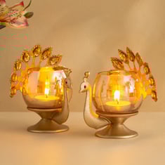 Bring artistic elegance to your decor with these T-light holders. Featuring intricate metal peacock detailing with embedded stones and glass holders, they add a warm glow and a touch of regal beauty to any space.