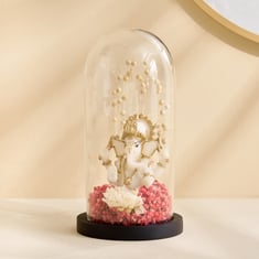 Enhance your decor with this beautiful figurine featuring a serene sitting Ganesha idol, preserved fresh flowers and foliage, and an elegant glass dome. This is perfect for a timeless home decor, thoughtful gifting, or in peaceful meditation corners.