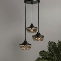Illuminate your dining room or living room with this striking cluster pendant features three graduated half globe shaped lights with half metal and half crystal suspended from a round plate on black-finished rods artfully displayed at different heights. Rich, rustic, and unmistakably stylish, this gorgeous 3-light hanging fixture marries brilliant character with impeccable taste. The lights hang at separate lengths supported from an antique black iron base. Fits E27 Edison Vintage bulbs (Bulbs not included), 1 meter Hard Wired Corded Electric, 220-240v, 60-watt Maximum Power. Perfect for House, Bedroom, Living Room, Dining Room, Foyers, Bar, Restaurants, Coffee Shop, Club Decorations. DISCLAIMER: Bulbs are not included