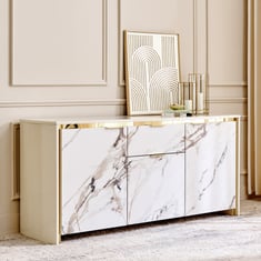 Elevate your living room with this sideboard, featuring an engineered wood frame, a durable ceramic top, and robust metal components. The ceramic surface is non-porous and resistant to spills, scratches, cuts, and heat, making it perfect for tabletops. Its glossy finish enhances modern decor. The electroplated metal design provide resistance to tarnishing, corrosion, and heat, while ensuring greater longevity and impact strength. It offers a combination of cabinets, drawers, and open shelves, providing ample storage for crockery, linens, or decorative items.