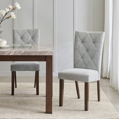 Elevate your dining experience with this pair of dining chairs. These chairs are thoughtfully crafted with a tufted design to offer excellent full-back support. The durable rubber wood frame provides stability and strength. The polyester upholstery offers an elegant feel, making these chairs both comfortable and stylish.