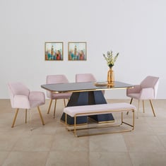 Bring a luxe touch to your dining space with this dining set featuring a 6-seater table with an 8mm thermally processed clear glass top with marble print and an engineered wood base. The chairs are upholstered in polyester velvet fabric and mild steel legs that are pretreated through the phosphating process to avoid rust over a period of time. The legs are electroplated to give the gold colour.