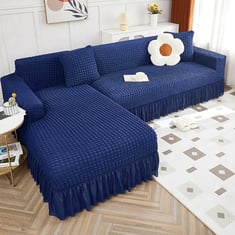 Transforms the bland and monotonous living room into vibrant and warm place. Revamp your sofa with our bubble sofa cover with frill specially designed for l shaped sofas. It is super stretchable & will protect your sofa from any dust & stains. Frill detail adds a vibrant touch to your sofa & enhances the overall look of your living room. Made from 92% polyester & 8% spandex these sofa covers are easy to install & easy to wash. Machine wash is also recommended