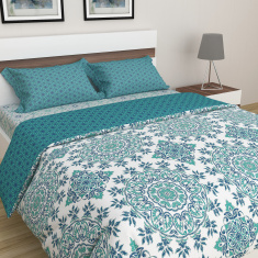 This vibrant and lightweight bed-in-a-bag set of four pieces is defined by a modish print on the surface to impart a fresh appeal to your bedroom decor. Crafted from 100% premium combed cotton for an extra soft touch and feel, it includes a double bedsheet with a pair of pillow covers and a comforter, featuring similar prints, to create an eclectic mix of comfort and style. The mercerised cotton gives the fabric a fine finish while the 210 TC yarn used creates a compact structure along with a satin weave for extra sheen.