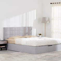 This queen bed from Home Centre is must have piece of furniture in your curated home. Made with pinewood which is a lightweight, soft wood known for its stiffness, shock resistance, and workability. A protective plastic layer faced on prelam engineered board which offers higher resistance against scraches, dents, moisture, heat and stains. It complies with the certified European Emission standard E2 grade, ensuring safety for indoor furniture applications. This bed is equipped with hydraulic lift capacities ranging from 60 kg to 125 kg ensure easy lifting, quiet operation, and long-term durability. This hybrid design features built-in storage beneath the bed frame, offering convenience for organizing frequently used items with 2/3 accessible via a heavy-duty hydraulic lift system and less frequently used items stored in the box storage secured with top panels. The hydraulic system makes it easy to lift the bed and access ample storage space for extra linens, clothes, and other items, keeping the bedroom clean and clutter-free. The decorative aesthetics are enhanced with solid and textured polyester velvet fabric, which elevate the look and are easy to spot clean and maintain over time. The design is visually appealing and features a height convenient for sitting upright with back support, ideal for reading or watching TV.