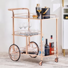 Roll in style and elevate your hosting game with this chic serving trolley. With a tempered glass top, this trolley offers unparalleled heat resistance and durability, ensuring it withstands the pressures of everyday use. Crafted from high-gauge, non-magnetic mild steel, its sturdy construction provides exceptional load-bearing strength, perfect for serving drinks or displaying culinary creations. Enhanced with electroplating to resist tarnishing and corrosion, this trolley not only exudes modern elegance but also promises longevity and resilience against impacts and shocks.