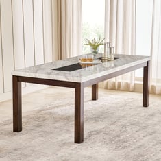 Elevate your dining room and add a touch of contemporary elegance with this dining table. It features a beautiful faux marble top with a toughened glass inset at the centre and MDF underlay. The toughened glass withstands heat, pressure, and compression far better than ordinary glass. The rubber wood legs offer sturdy support and a timeless look. With a spacious rectangular design, this dining table comfortably seats up to eight people, making it perfect for family dinners, gatherings, and special occasions.