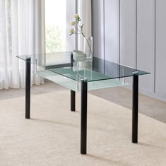 Add elegance and functionality to your dining room with this rectangular table. Designed to seat up to 6 people, it features a tinted tempered glass top that is resistant to heat, pressure, and compression. The open glass shelf under the top comes in handy for storing dining essentials. The cylindrical legs are made from non-magnetic mild steel that offers good durability and load-bearing capacity.