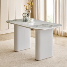 Enhance your banquet space with this 4-seater dining table. The tabletop features a ceramic surface, known for its robustness and non-porous qualities, making it resistant to spills, cuts, scratches, and heat. The base is made from MDF, a compressed fiberboard strengthened with hardwood extracts, offering a strong core and excellent screw-holding capacity. It is also chemically treated to protect against termites and borer infestations.