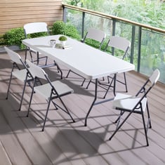 Upgrade your dining experience with this foldable 6-seater dining set. Its robust HDPE top resists wear and tear, making it suitable for various uses. The legs are constructed from high-gauge, non-magnetic steel for outstanding durability and load-bearing capacity. The accompanying folding chair combines HDPE and mild steel for strength and durability, featuring a medium back for lumbar support, accommodating both children and adults, with a tested weight limit of 110 kg. The foldable design ensures easy storage and transport, perfect for picnics, camping, or outdoor gatherings.