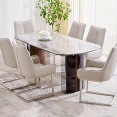 Enjoy a good meal in luxury with this dining set. It has a 6-seater dining table made of full core stone that features a marble pattern created using decorative paper. The top is heat and fire-resistant as well as non-porous. The base is made of MDF which is fibre boards compressed with hardwood extracts that provide good load-bearing capacity. The 6 chair frames are made of high gauge, non-magnetic mild steel that showcases excellent durability and load-bearing capacity. The seats and medium backrests are covered in PVC which lends a striking, elegant look. The top is made of full-core stone that features a marble pattern created using decorative paper. The top is heat and fire-resistant as well as non-porous. The base is made of MDF which is fibre boards compressed with hardwood extracts that provide good load-bearing capacity.