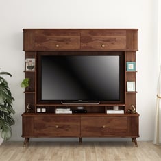 View AllView the collection NewGet this TV Stand from Home Centre to brighten up your living space. Crafted from prelaminated engineered wood with a melamine finish, it boasts a robust core and great screw-holding ability. The melamine prelam features a protective plastic coating on the engineered board, ensuring superior resistance to scratches, dents, moisture, heat, and stains. Furthermore, the tempered glass is heat-treated to reduce breakage risks from falls. Offering generous storage options, this TV unit comes with external drawers and open shelves for your convenience.