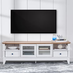 Add an element to your living room with this TV unit from Home Centre. Made with engineered wood and a toughened glass. The matte finish, featuring a polymer-based paint, offers a smooth touch and reflective feel to the furniture. The paint is uniformly spray-applied across the panel fronts and edges for a seamless appearance. This TV unit comes with external drawers, open shelf cavities, and swing doors for storing multimedia items and digital devices, while the cabinet top surface is the perfect location for displaying decor items and family photos. This furniture piece is designed to accommodate a 55-inch TV, along with a small space for a router and set-up box.