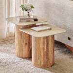 These nesting tables enhance your living room with durable style. Their kiln-dried and chemically treated mango wood base resists seasonal changes, ensuring stability. Laminated wood legs provide added strength, while the non-porous ceramic top is highly resistant to spills, scratches, and heat. Flaunting a sturdy top, the tables can be adorned with accent pieces for an appealing look.