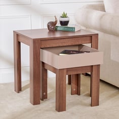 Make your living room elegant with these nesting tables made with engineered wood. Designed with wooden legs, and storage space, these nesting tables are a must-have in your home collection. The fibre boards compressed with hardwood extracts possess stronger cores with strong screw-holding capacity and are chemically treated against termites and borer infestation. A protective plastic layer faced on a prelim-engineered board offers higher resistance against scratches, dents, moisture, heat, and stains.