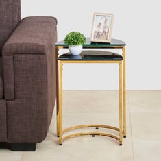 Showcasing a geometric profile, this set of nesting tables features a thermally processed glass top that is resistant to heat, scratch, and impact. The frame is made from engineered wood and the electroplated legs are crafted from pretreated metal to prevent rusting over time.