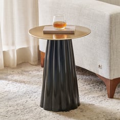 Make a bold statement with this striking accent table. Featuring a luxurious gold top and a matte black base, both crafted from high-gauge, non-magnetic mild steel it blends exceptional durability with sleek industrial style. Ideal for showcasing decor, this piece adds a sophisticated, edgy touch to any modern living room.