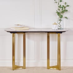 The primary feature of this furniture piece is the original marble top, carefully selected for its flawless appearance and polished to enhance the natural patterns of the stone. It is heat, scratch, and stain resistant, ensuring easy long-term maintenance. The bottom support of the furniture is made of plywood, which offers the advantages of the parent wood while its laminated structure provides enhanced properties. Plywood's cross-laminated construction ensures stability under temperature and moisture changes and its high strength-to-weight ratio makes it cost-effective for structural applications. The primary materials used include the original marble top, while the metal frame is made of MS metal with a gold lacquer finish, providing durability, load-bearing capacity, and rust resistance through a pretreatment phosphating process.
