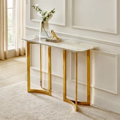 Bring refined elegance to your space with this console table, showcasing a heat-resistant, non-porous faux marble top with sleek chamfered edges. It's supported by a stainless steel frame, combining lasting durability with modern design versatility.