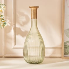 Give a finishing touch to your space with this vase. It is made of glass with a metal top. The narrow top and ribbed detailing add an interesting visual look. Display this vase on its own or with a freshly cut flower for a decorative look.