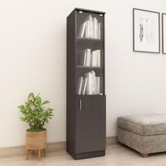 Show off your literary prowess with this elegant book cabinet made from engineered wood with a melamine finish to prevent scratches. The top part features a temper glass door manufactured through a process of extreme heating and rapid cooling to ensure toughened durability and a push button with a magnetic catch for seamless opening and closing of the door. It also includes a bottom cabinet with a half-moon handle that conceals additional storage space.