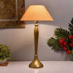 This modern-style table lamp has a gently curved and classic shade that gives it a cool, contemporary look. It is gold-brushed and features a shade. It has a convenient on/off switch, and a 1.5-metre-long wire with tested and approved standards for perfect and safe lighting. The lamp is versatile enough for use in a bedroom. Place it in a bedroom that needs a stylish touch and a source of extra lighting; position it on an accent table in a living room or dining room decorated with clean lines and minimalist decor.
