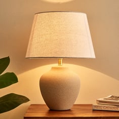 Add a touch of timeless charm to your home with this elegant table lamp. Crafted from high-quality ceramic with a textured finish, it offers both durability and refined style. The linen shade in an empire profile softens the light, creating a warm and inviting glow.