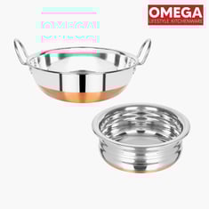 Cook with efficiency and style with this cookware set. Made from durable heavy-gauge stainless steel, it features a thick copper base that ensures efficient cooking. The set includes a handi and a kadhai. With ergonomic, heat-resistant handles and a sleek mirror finish, this set adds elegance to your kitchen while being easy to clean and maintain.