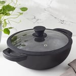 Whip up delicious dishes in this kadhai. Made of cast iron, which enriches the food with iron content. The ergonomically designed handles make it easy to hold this kadhai. The glass lid locks the steam, heat, and flavour. It is pre-seasoned and gives a natural non-stick coating to the cookware.