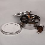 This authentic steel masala dabba is to keep your spices within an easy reach! Comes with a lid, this extremely functional masala box is a must have for every Indian kitchen. Ergonomically designed masala box that helps avoiding spillage or mixing of content inside. Comes with a perfectly sized spoon for easy usage. Ideal for all day use at home for keeping masalas.