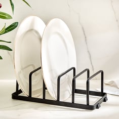 This metal plate holder is a sleek, sturdy accessory that keeps plates upright and organized. Made from durable carbon steel, it has an open-frame design for easy access and visibility. Perfect for kitchen counter tops, dining tables, or buffets, it prevents plates from tipping and facilitates easy display or retrieval.