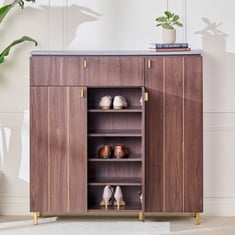 This shoe cabinet is an elegant and functional entryway addition that helps you keep your footwear organised and easy to reach. It is made of engineered wood with a prelaminated finish for enhanced durability. It has 3 doors and multiple shelves to accommodate up to 21 pairs of shoes. The top drawer is ideal for holding socks, shoe cleaners, and other accessories. The metal legs and cabinet hardware pulls lend a luxe touch.