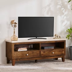 Make this exquisitely made TV unit the focal point of your living space. The frame is constructed from mango wood. The top is made of composite marble that is made by blending 90 percent natural marble chips and polyresin or colour pigment that lends a durable finish and is stain resistant. The unit includes 2 open shelves to place digital devices or display books. The two drawers at the bottom are equipped with a telescopic channel and built-in stopper that allows full extension. It also has cut-outs at the back for cable management. Legs are made of laminated wooden panels sandwiched and boxed for good weight-bearing capacity.