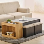 Add a focal point to your living space with this coffee table. Made from engineered wood, this rectangular centre table features a side-open shelf and top storage space. It includes 2 stools with upholstered seats and wheels at the bottom that provide additional seating options.