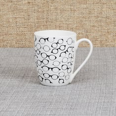 Designed from delicate bone china rendered in retro glasses print, this mug makes for a stylish beverage container.
