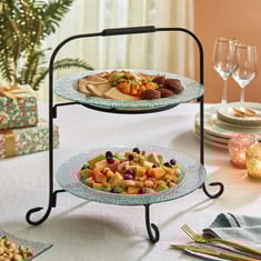 Serve delicious snacks in style on this serving platter. It includes a tiered iron stand that is designed to hold glass platters with a textured non-reactive surface that does not absorb food or odour.