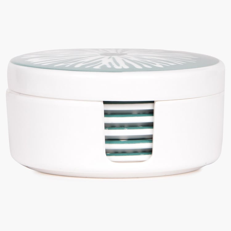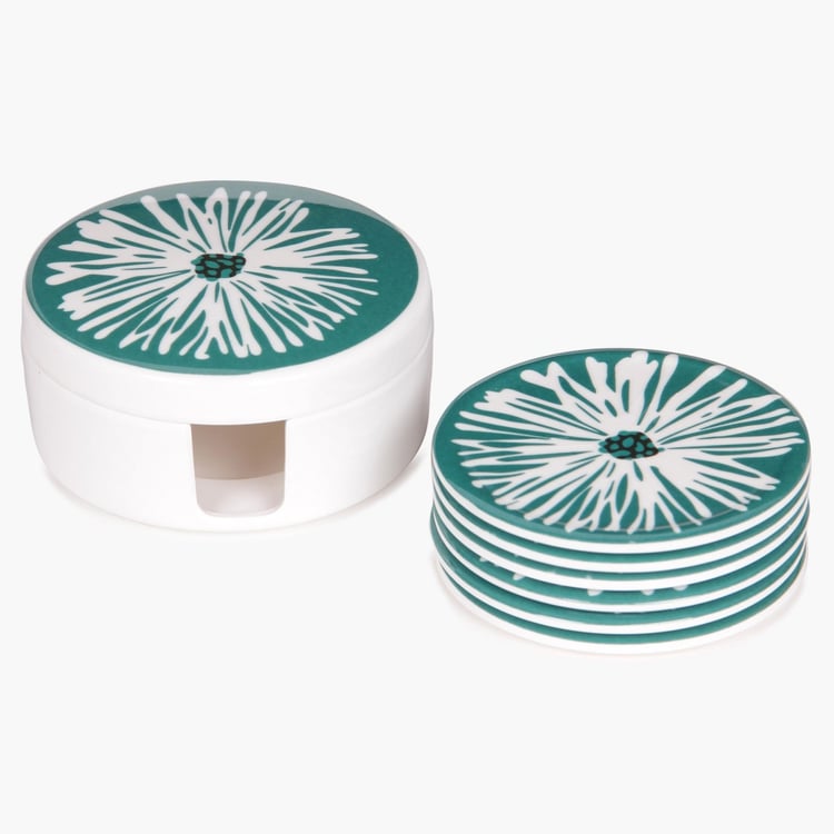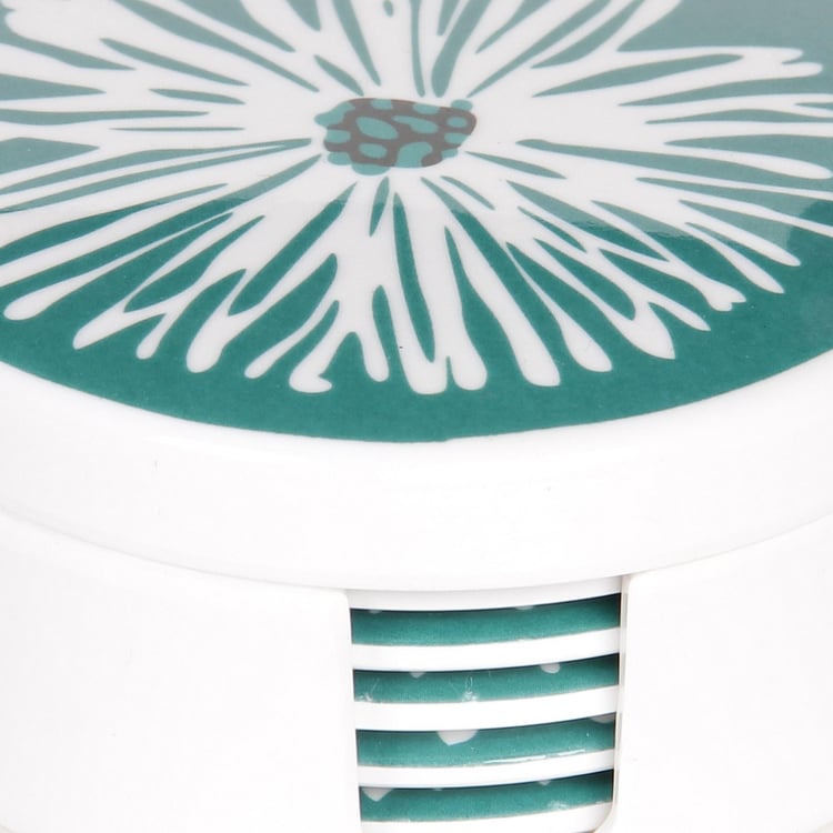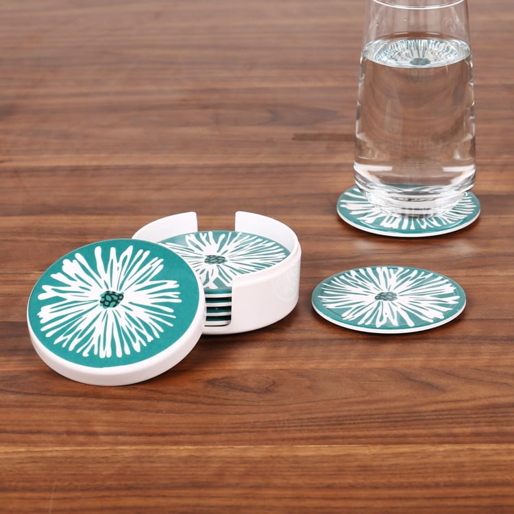 Crafted into sleek coasters from food grade melamine, this Set comes accompanied with a closed stand and features a penchant print to add beauty to your dining table!