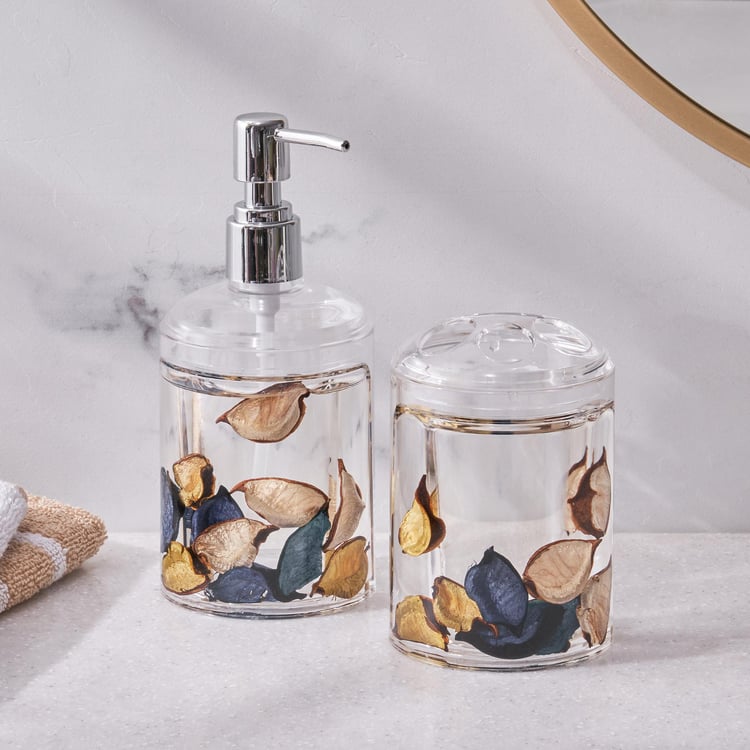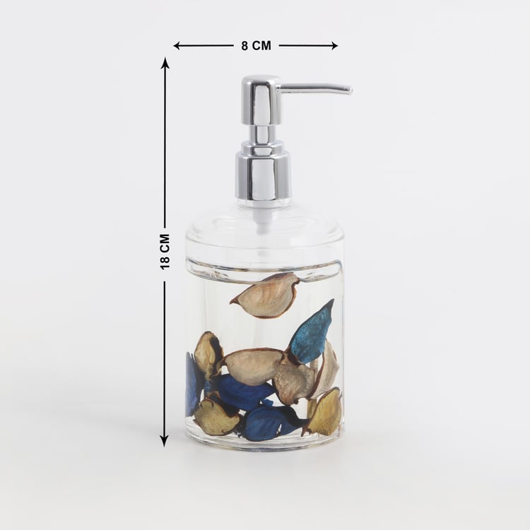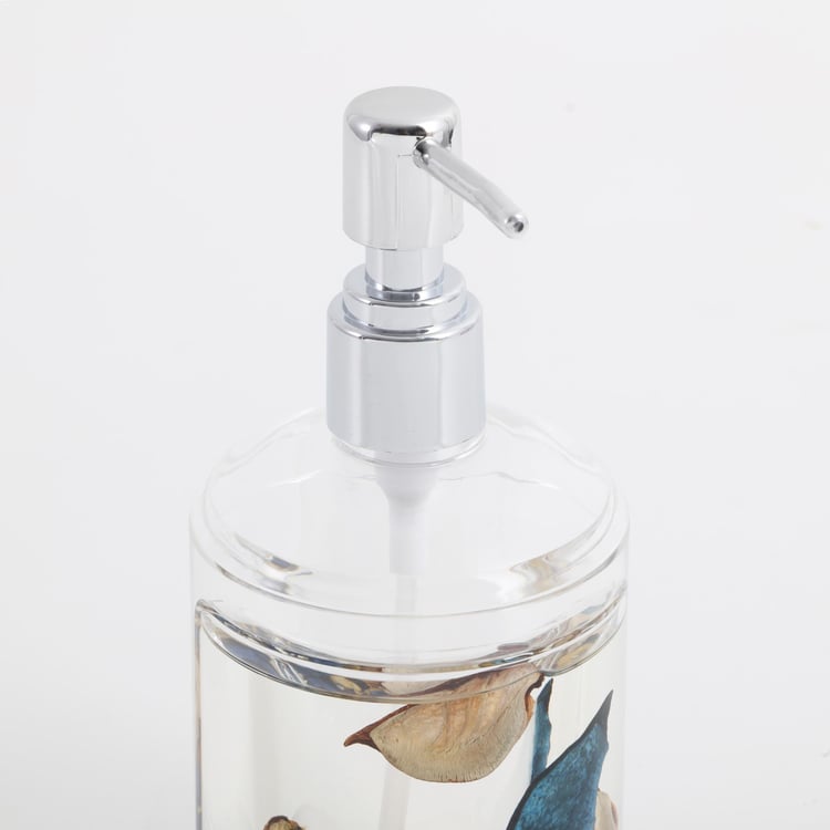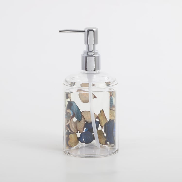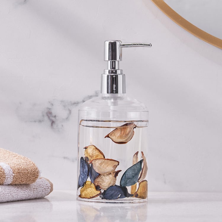 Add a vibrant touch to your bathroom setting with this soap dispenser designed with an abstract design and a plastic body. This soap dispenser comes with a metal dispenser. Made with high quality, this product is sturdy and durable for everyday use.