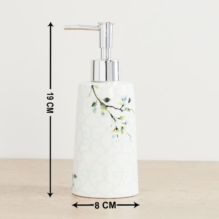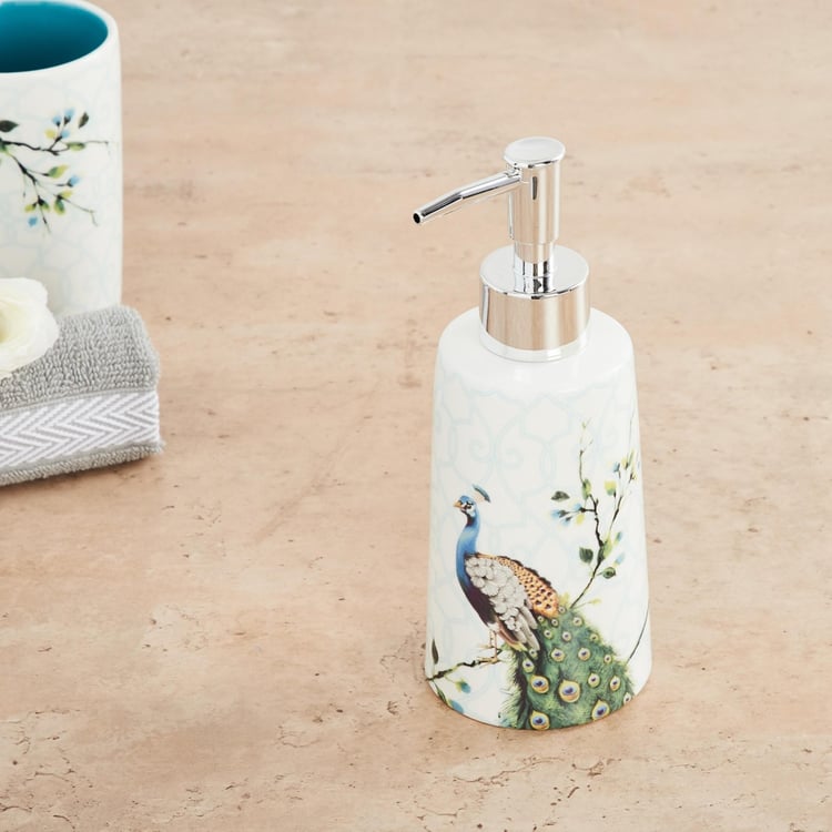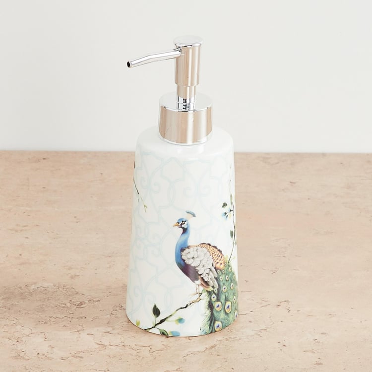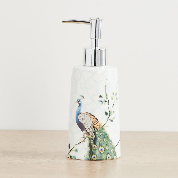 Crafted from a sturdy ceramic, this soap dispenser starring an enticing peacock print offers an eye-pleasing look and enhanced durability.